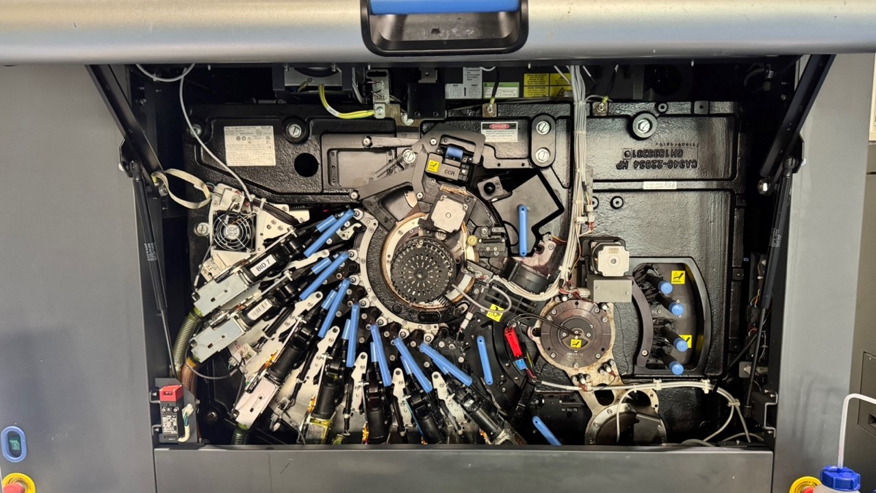 Impression Counter: Around 34 Mio. impressions (actual status), 7 colours authorized | 5 colours installed, OFIR (fast ink change), White Ink Option, Inline Spectrophotometer, Second-Pass Printing, Colour Automation Package, InLine Priming Unit enables easy on-demand treatment of substrates, Unwinder, Rewinder, Including Chiller Unit, HP Production Pro Server for L & P Model IN100T / Z8G4, HP Control PC , Press Software Version 16.x, HP SmS Designer 27.x License for Illustrator CC2023 (Mac and PC), System is still in HP Service Contract, The system is still in production for small runs, Expected to be available in May 2026